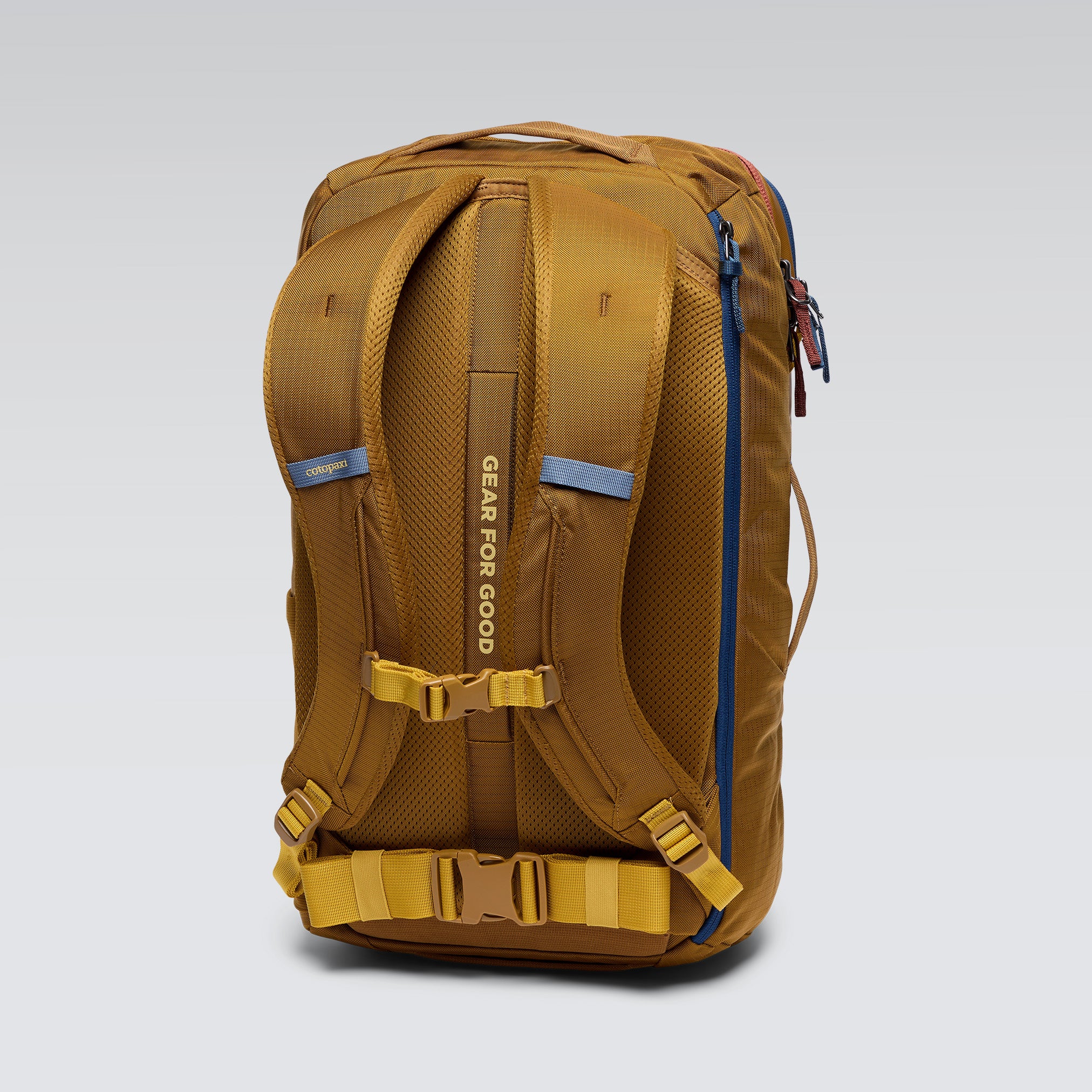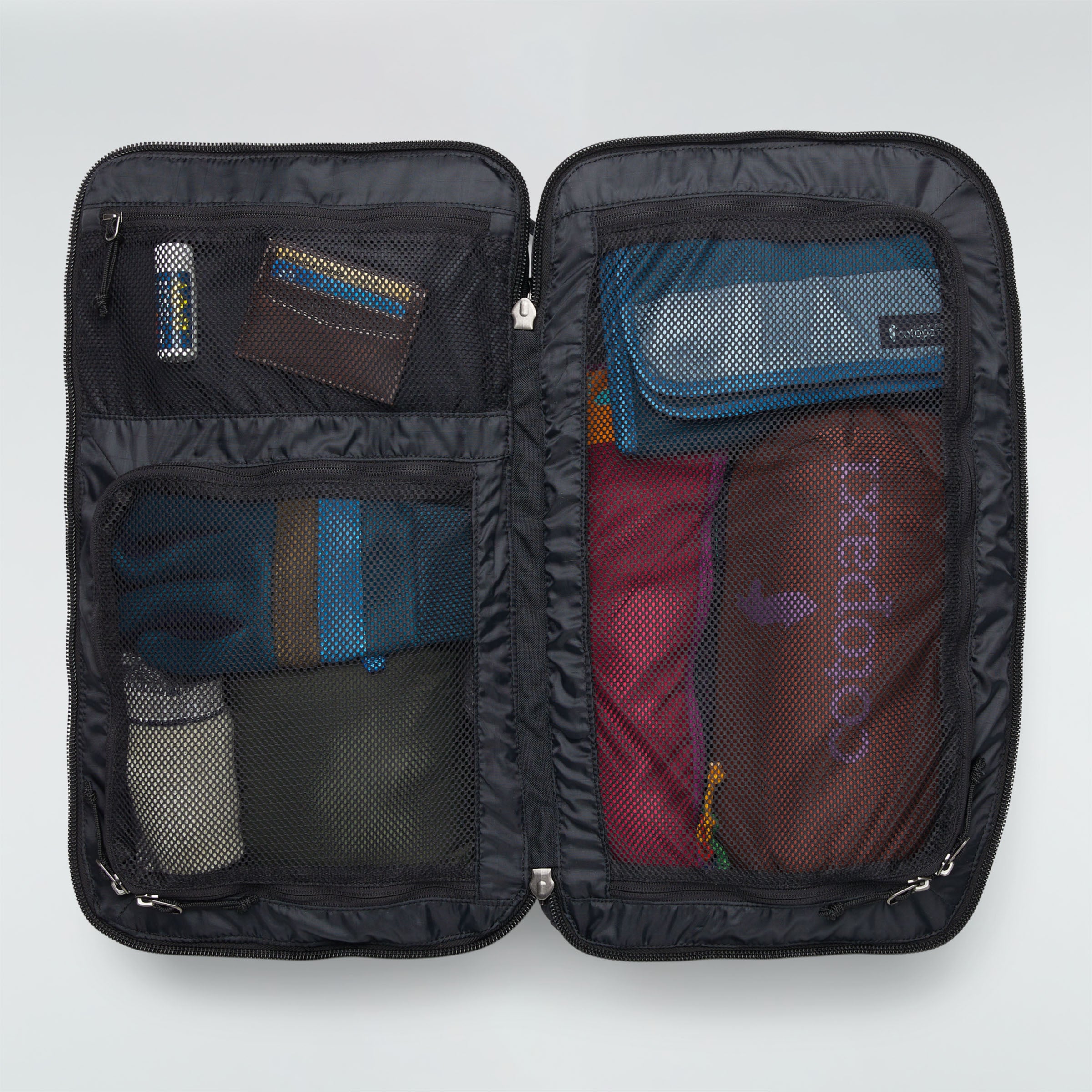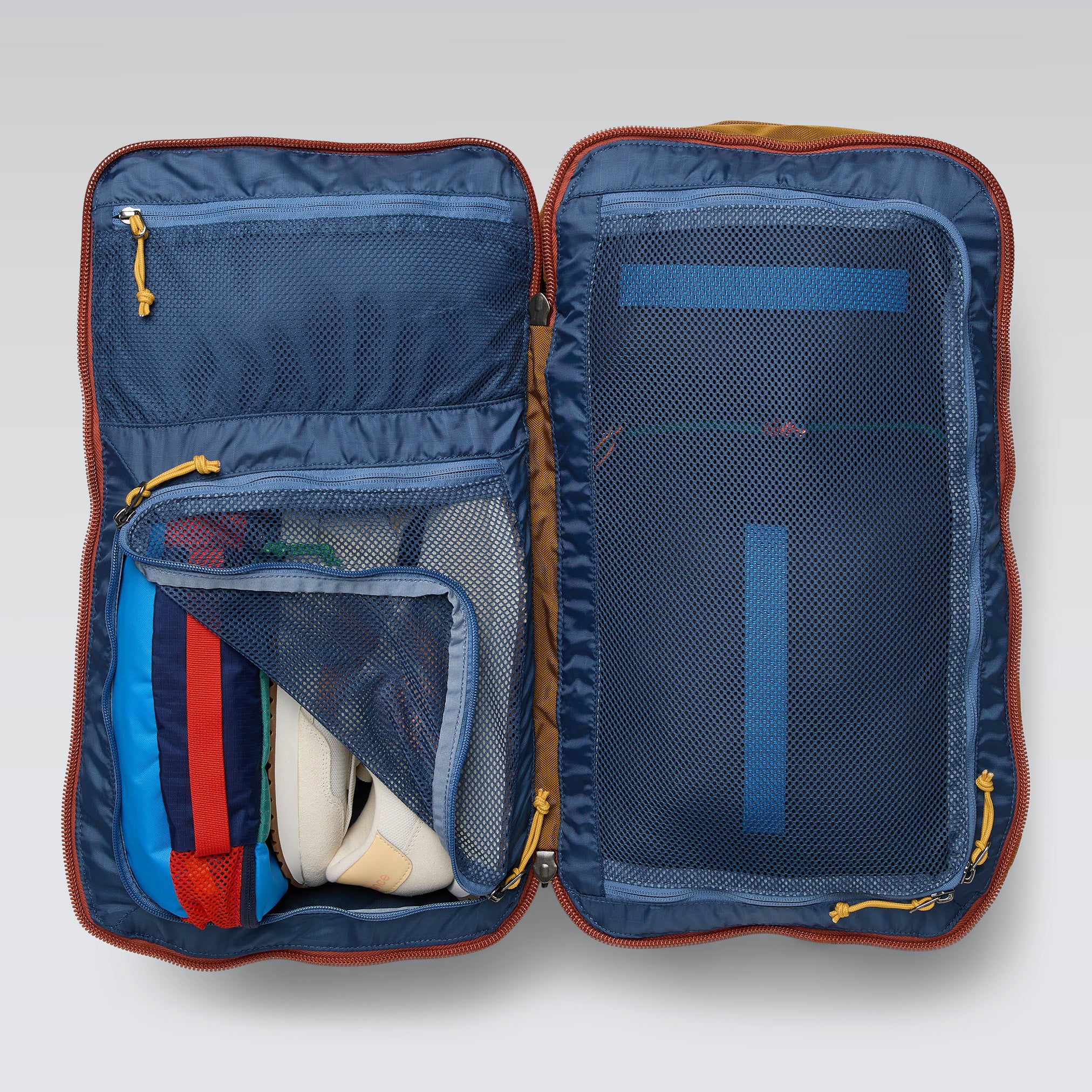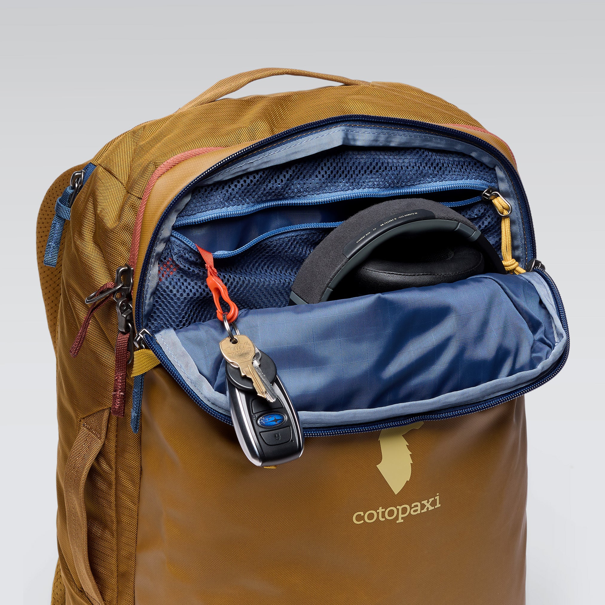 Das Hauptfach des Allpa ist über einen kofferähnlichen, umlaufenden Reißverschluss zugänglich, der einen einfachen Blick auf den Inhalt ermöglicht. Die beiden Hälften des Rucksacks sind durch Netztrennwände voneinander getrennt, damit beim Transport nichts verloren geht. Um den Rucksack noch sicherer zu machen, hat Cotopaxi die Kompressionsriemen im Inneren des Rucksacks entfernt und durch ein neues Reißverschlusssystem mit dynamischer Kompression ersetzt. Außerdem lassen sich die Netztrennwände des Rucksacks jetzt nach außen öffnen, was das Packen und Organisieren erleichtert.